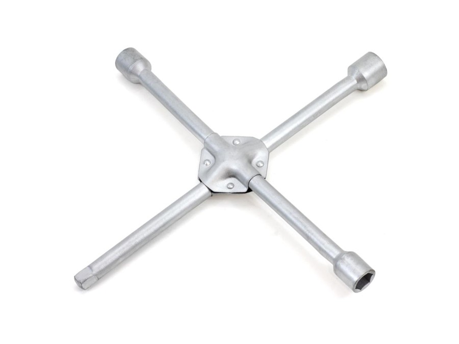 Wysokiej jakości klucz polecany do domowej wymiany kół i jako wyposażenie samochodów osobowych i dostawczych. Poradzi sobie z najbardziej zapieczonymi śrubami. Posiada 4 ramiona z nasadkami sześciokątnymi, 4 metryczne w rozmiarach 17mm, 19mm, 21mm i 1/2".