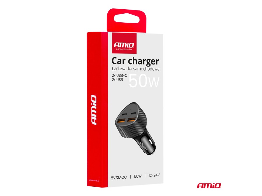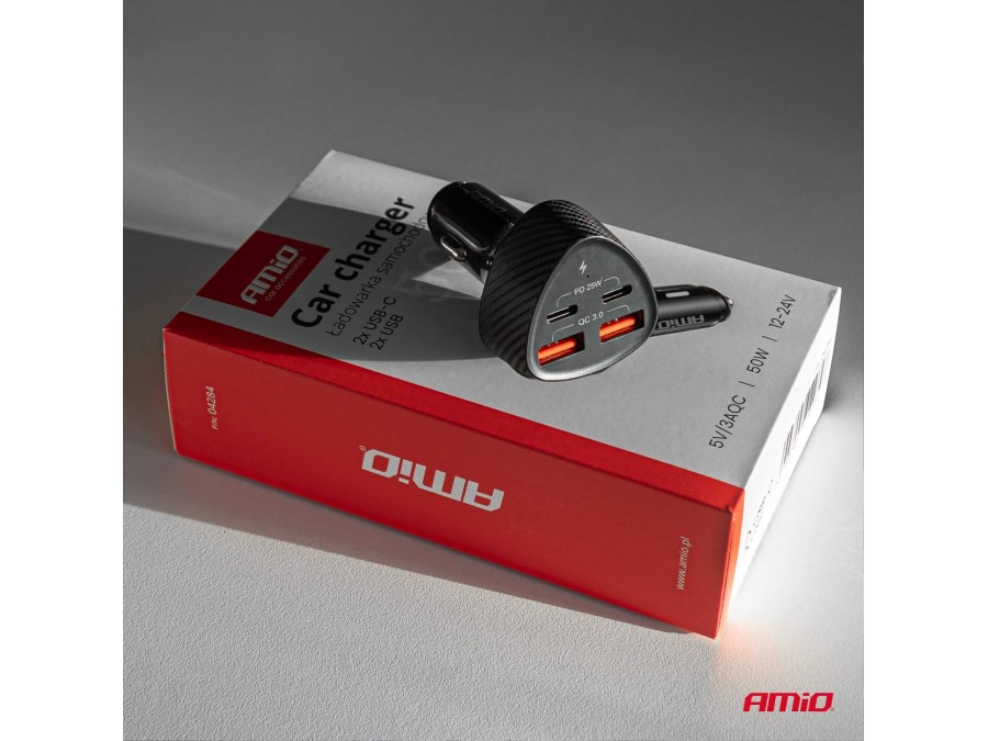 Ładowarka samochodowa 50W 2x USB-A + 2x USB-C AMIO-04284