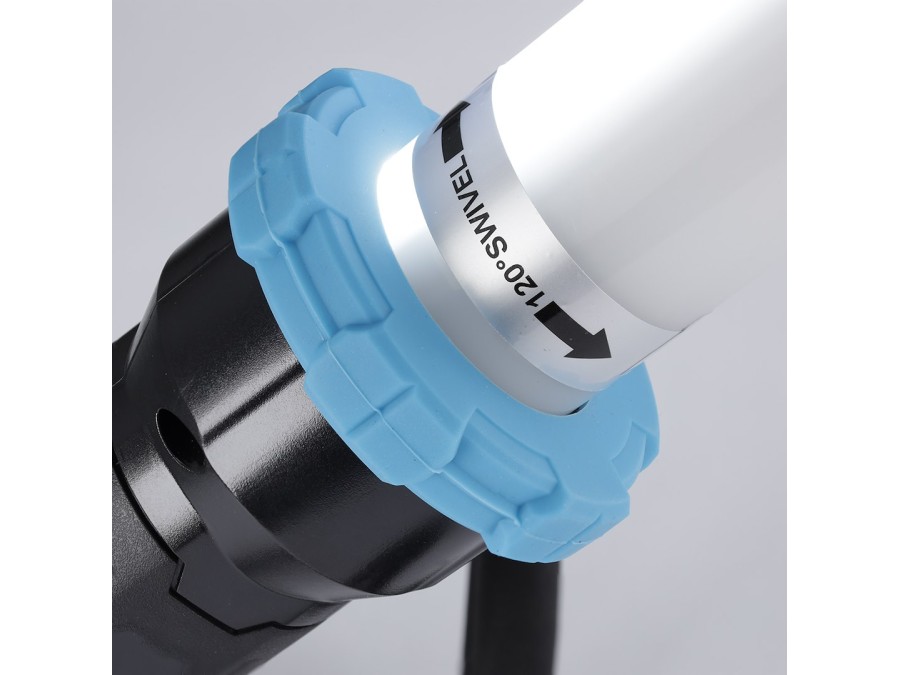 Dodatkowo tuba świetlna może być obracana w prawo i lewo w zakresie 120°, co pozwala dokładnie skierować światło tam, gdzie jest najbardziej potrzebne — bez konieczności przesuwania całej lampy. Taka funkcjonalność znacząco ułatwia pracę w trudno dostępnych miejscach.