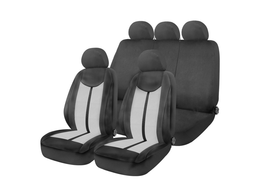 Zestaw 9-częściowy obejmuje pokrowce na dwa fotele przednie, tylną kanapę dzieloną oraz komplet zagłówków. Uniwersalne dopasowanie do większości modeli samochodów osobowych.