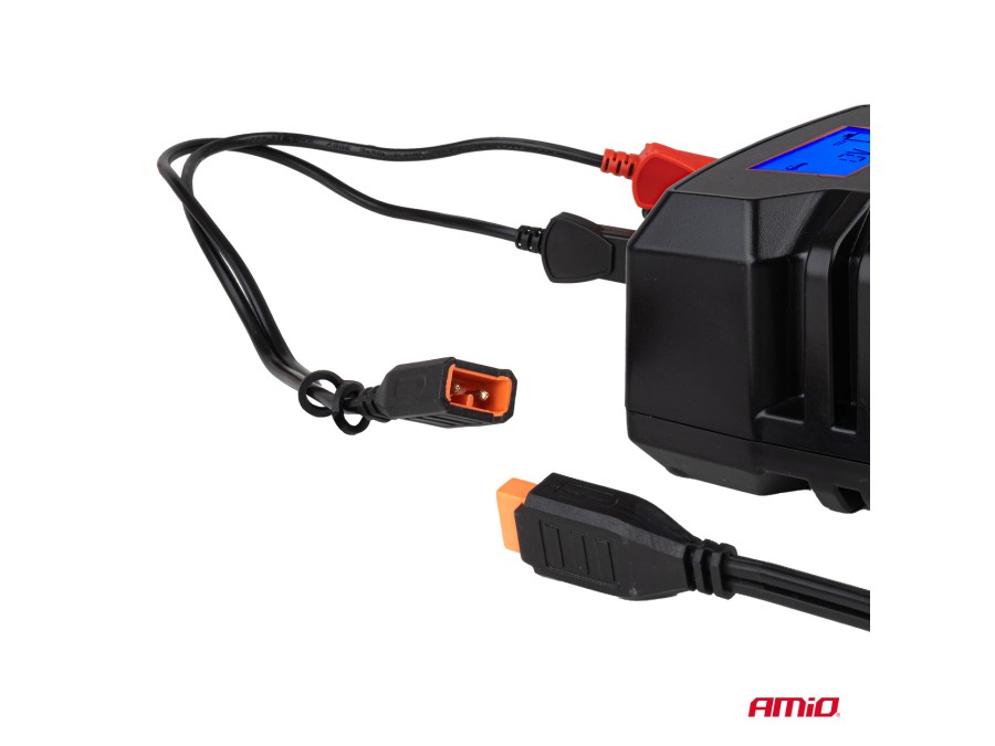 Cyfrowy prostownik AMiO PRO HOOK to nowoczesne i wygodne w użyciu urządzenie do ładowania akumulatorów AGM, GEL oraz LiFePo4 (LFP). Dzięki maksymalnemu prądowi ładowania 4 A i obsłudze napięć 6V i 12V, zapewnia szybkie, bezpieczne i efektywne ładowanie akumulatorów w samochodach osobowych, motocyklach, łodziach czy sprzęcie magazynowym. Ładowarka z funkcją podtrzymywania napięcia z wbudowanym hakiem do podwieszenia pod maską. Posiada szybkozłączkę oraz dodatkowe konektory oczkowe w zestawie. Optymalna do ładowania akumulatorów motocyklowych i benzynowych samochodów osobowych, dodatkowo posiada dedykowaną funkcję ładowania akumulatorów LFP.