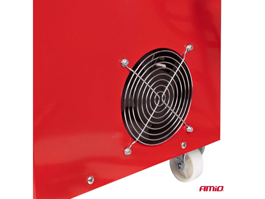 - Konstrukcja urządzenia wyposażona jest w solidny uchwyt oraz koła transportowe, co ułatwia przemieszczanie prostownika w różnych warunkach