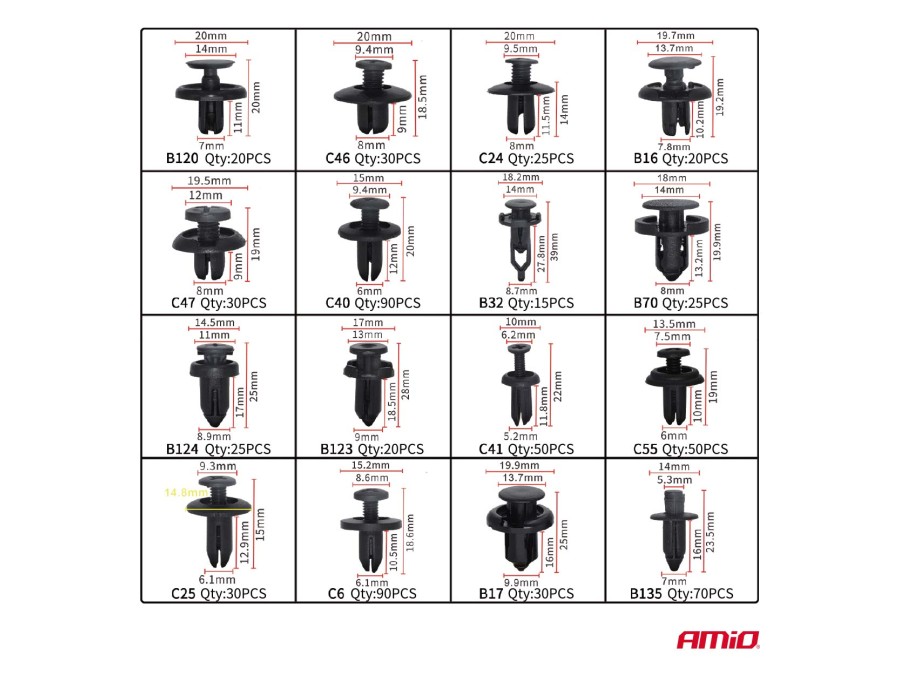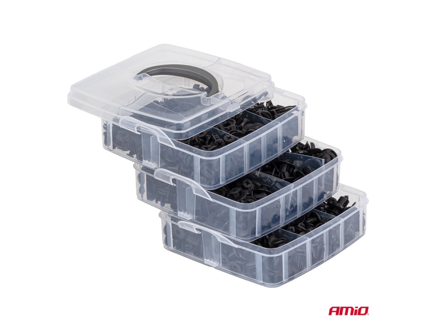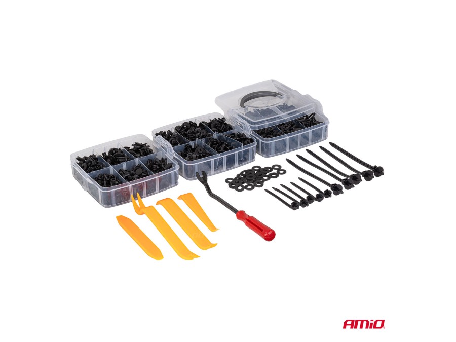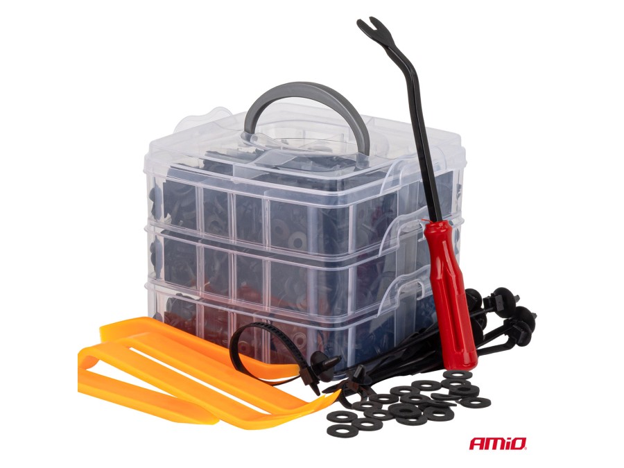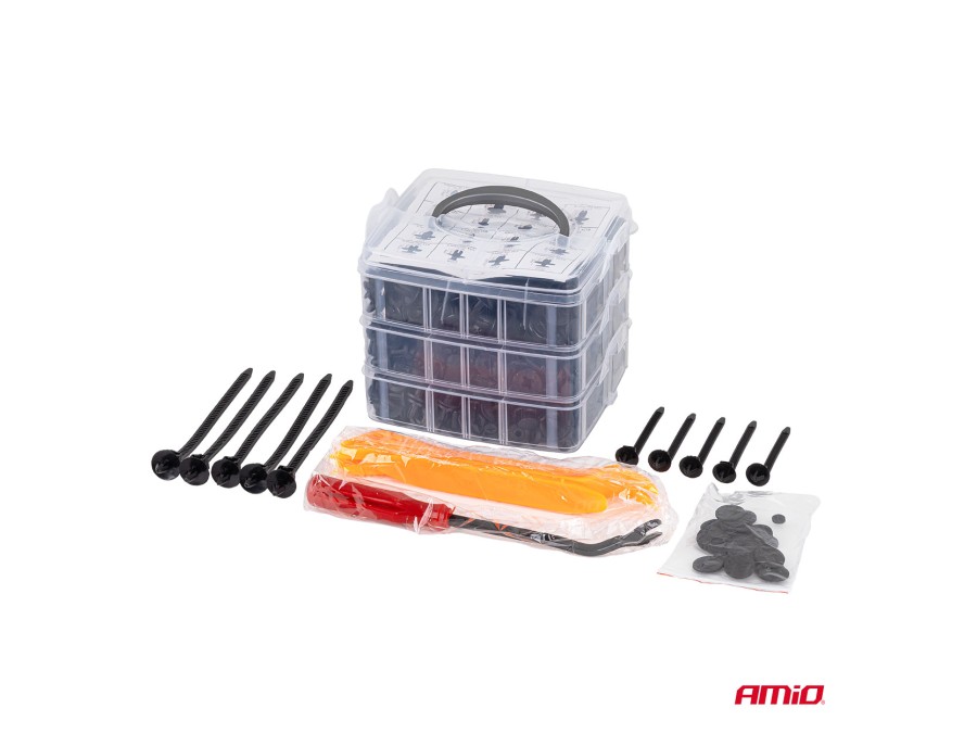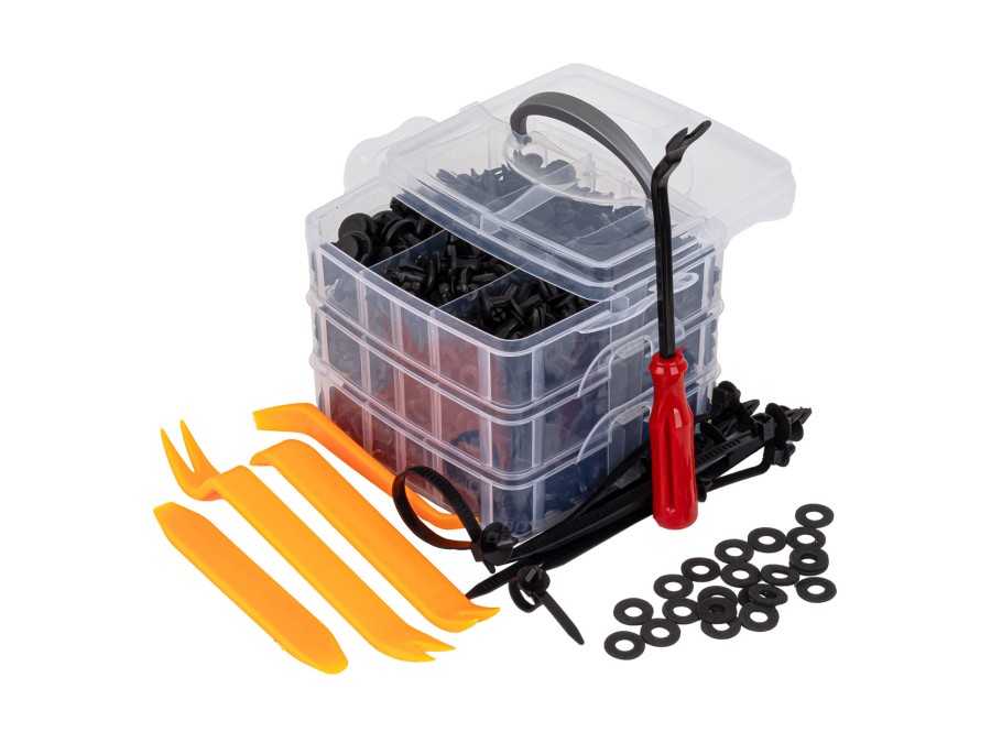 Zestaw uniwersalnych elementów mocujących, klipsów, kołków wraz z narzędziami do ich demontażu łącznie 650 elementów. Wykonane z wysokiej jakości tworzywa PVC, zapewniają trwałość i odporność na uszkodzenia.