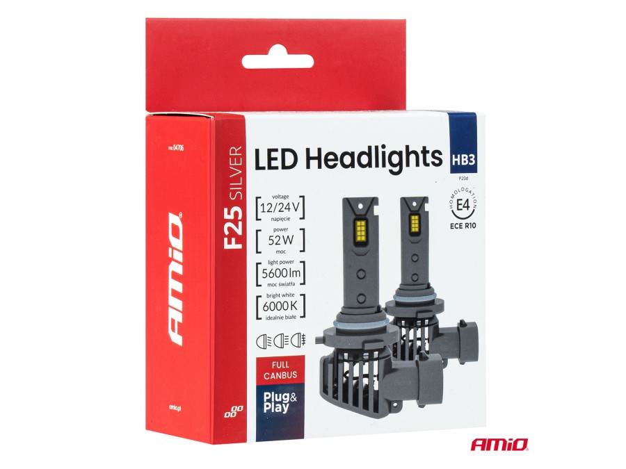 Profesjonalne żarówki LED przeznaczone do reflektorów przednich pojazdów osobowych i ciężarowych, z trzonkiem HB3 / 9005. Model F25 SILVER Edition wyposażono w technologię FULL CANBUS, eliminującą sygnalizowanie błędów spalonej żarówki w systemie pojazdu, bez potrzeby stosowania dodatkowych rezystorów.
