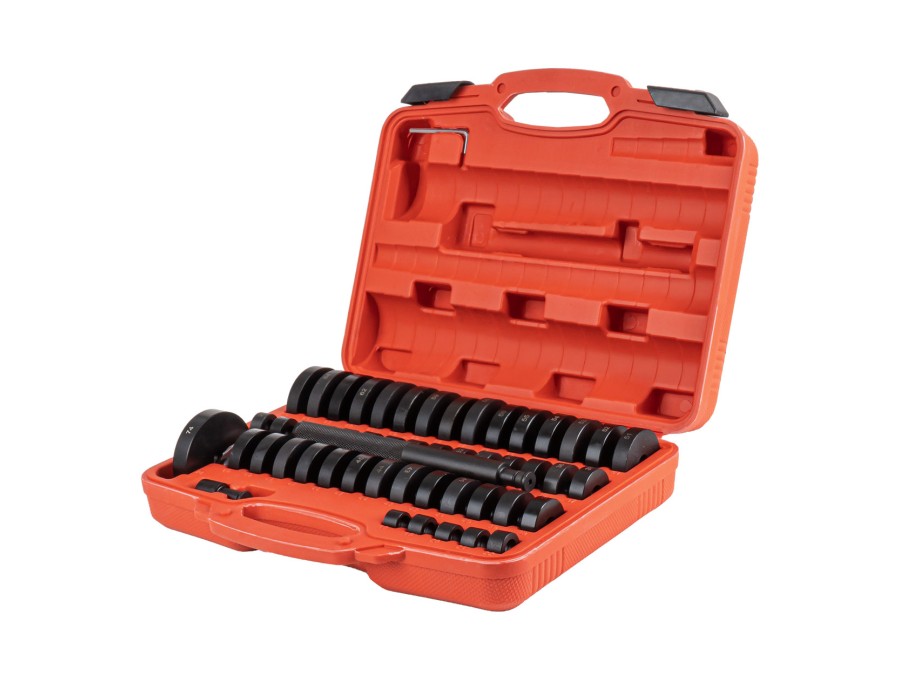 Kompletny system adapterów uderzeniowych i prasujących zaprojektowany do osiowego montażu oraz demontażu łożysk, tulei, pierścieni uszczelniających (simmeringów) oraz uszczelek. Zestaw 52 elementów gwarantuje idealne dopasowanie do niemal każdego komponentu, eliminując ryzyko uszkodzenia gniazd oraz nowych części podczas osadzania.